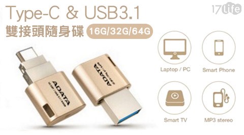 商品訊息簡述: 只要388元起(含運)即可享有【威剛Adata】原價最高1,680元Type-C USB3.1雙接頭隨身碟(UC350)1入:(A)16GB/(B)32GB/(C)64GB,保固一年。